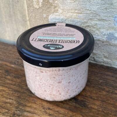 Zutaten: 65% Schweinefleisch, 35% Schweinefett, jodiertes Nitritpökelsalz (Kochsalz, Natriumnitrit), Gewürze und Geschmacksverstärker